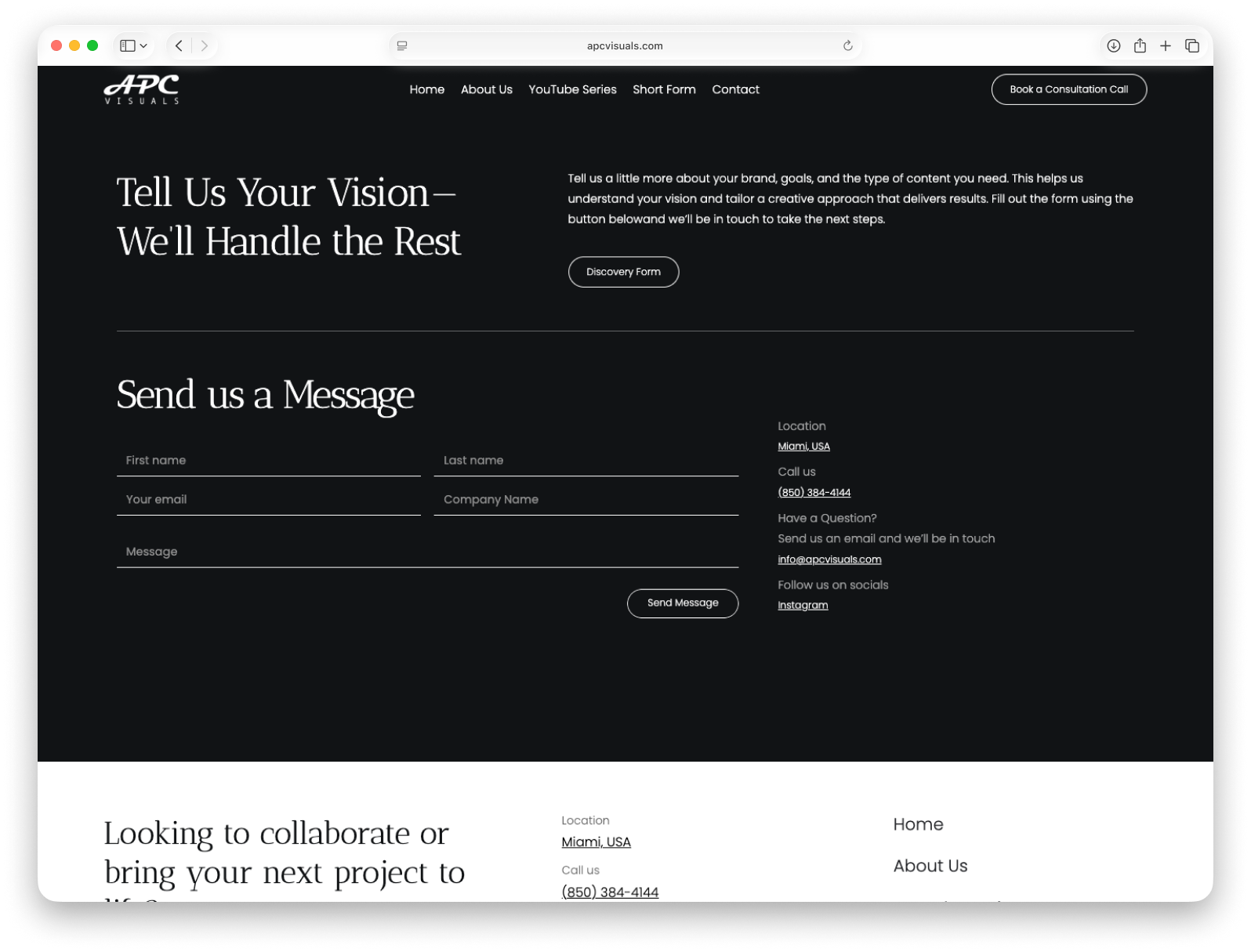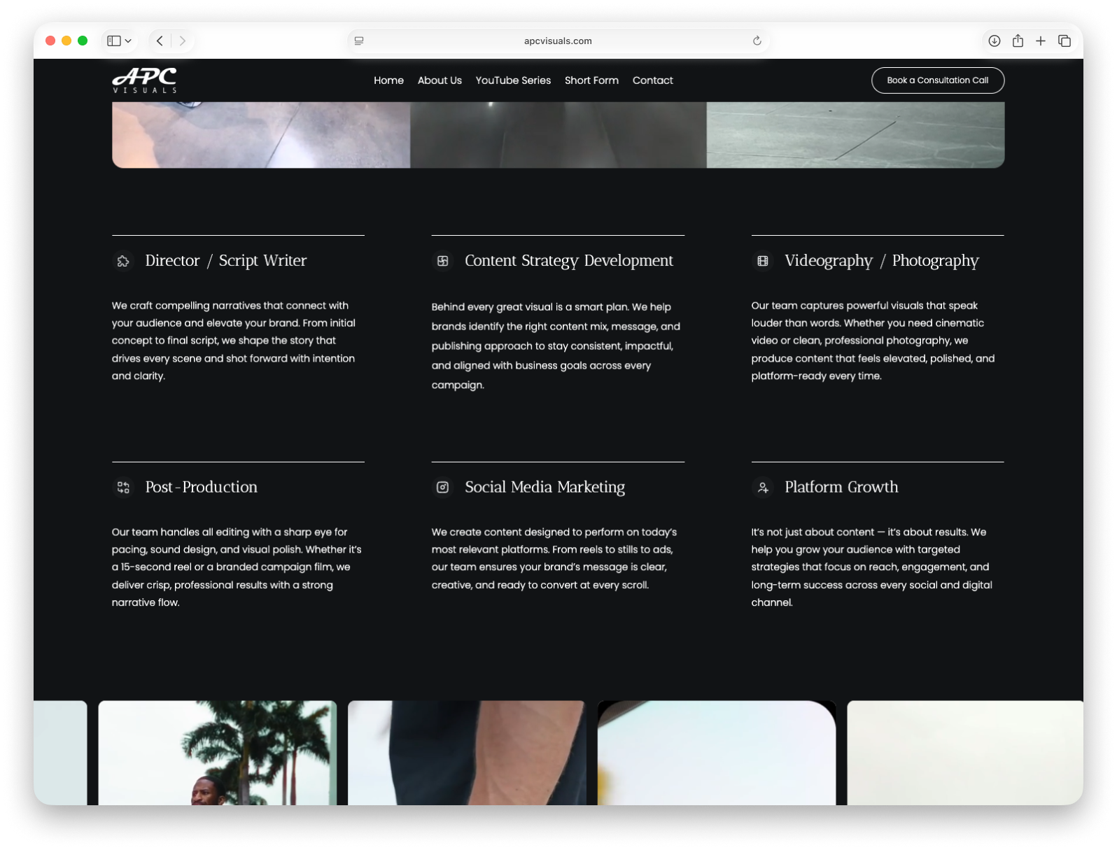 APC Visuals is a Miami-based video production studio creating cinematic content for modern, fast-growing brands. We designed a refined digital presence that reflects the studio’s high-end production quality—combining bold visuals, clean structure, and a seamless user experience to showcase their work with clarity and impact. The result is a portfolio-driven website that positions APC as a full-service creative partner, from strategy and storytelling to production and growth.