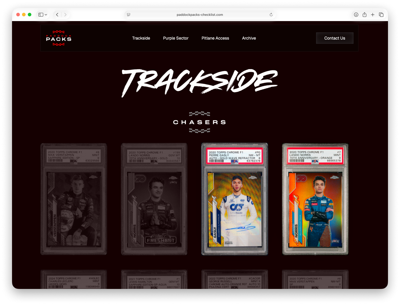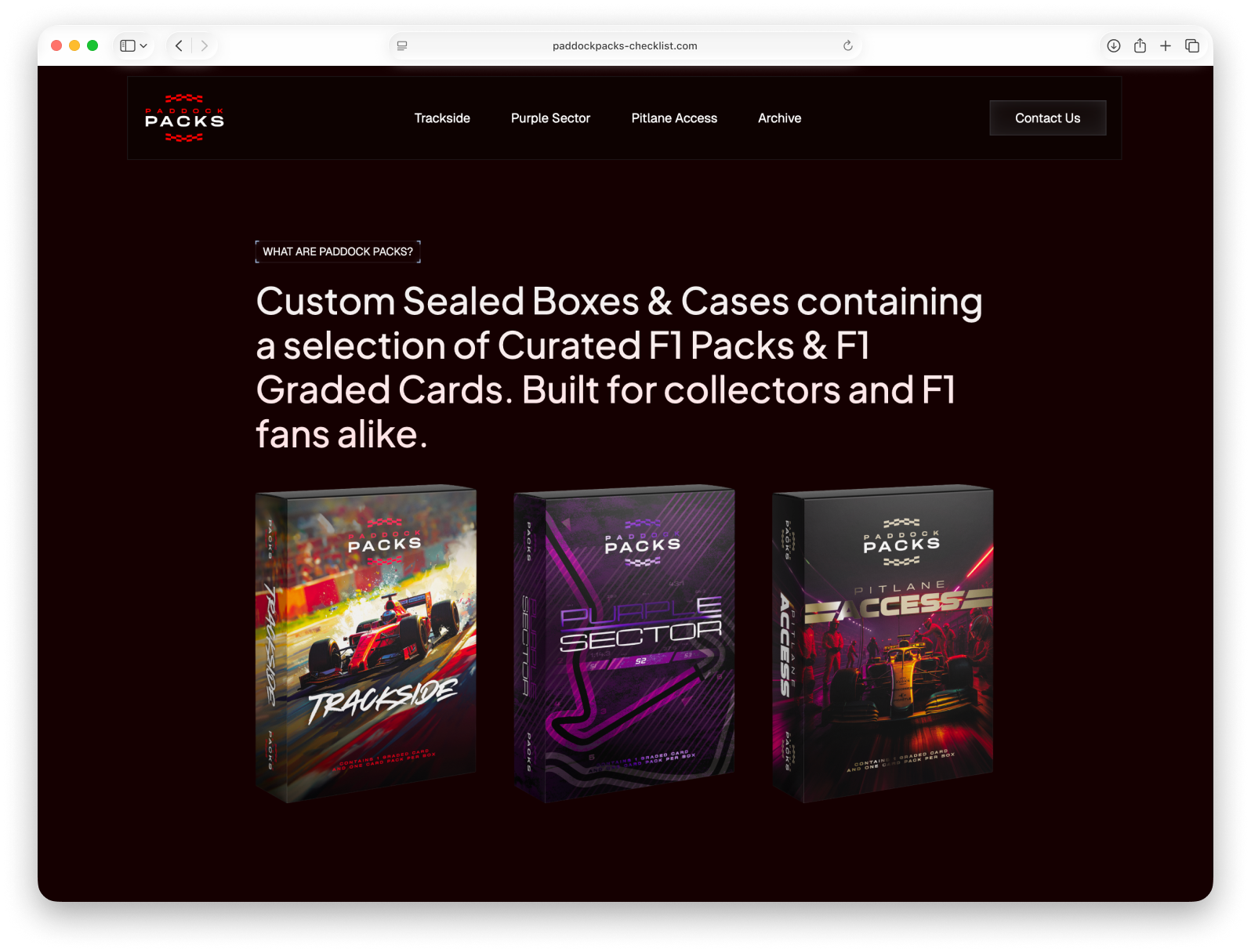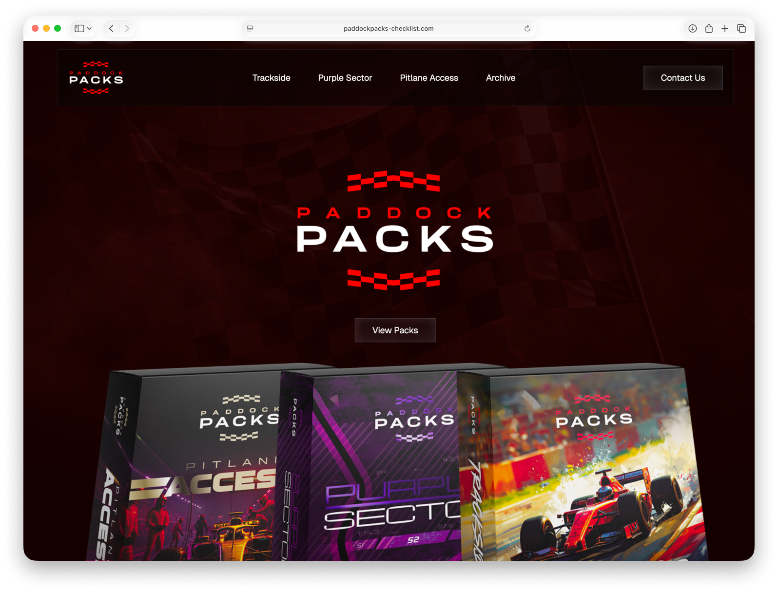 The Paddock Packs website was designed and developed to deliver a streamlined, high-conversion experience for an audience primarily arriving from Instagram. The focus was on clearly communicating the product—custom Formula 1 trading card packs—while maintaining a simple, visually engaging interface. The structure highlights the three pack offerings upfront, reinforces the concept of chase cards, and directs users toward the primary conversion action: initiating contact via Instagram. To support this, a custom visual system was implemented, including pack breakdown graphics, card checklists, and “Top 10 Chase” highlights to build excitement and transparency. The result is a lightweight experience that feels premium while making it easy for users to understand the value of each pack and take action quickly.