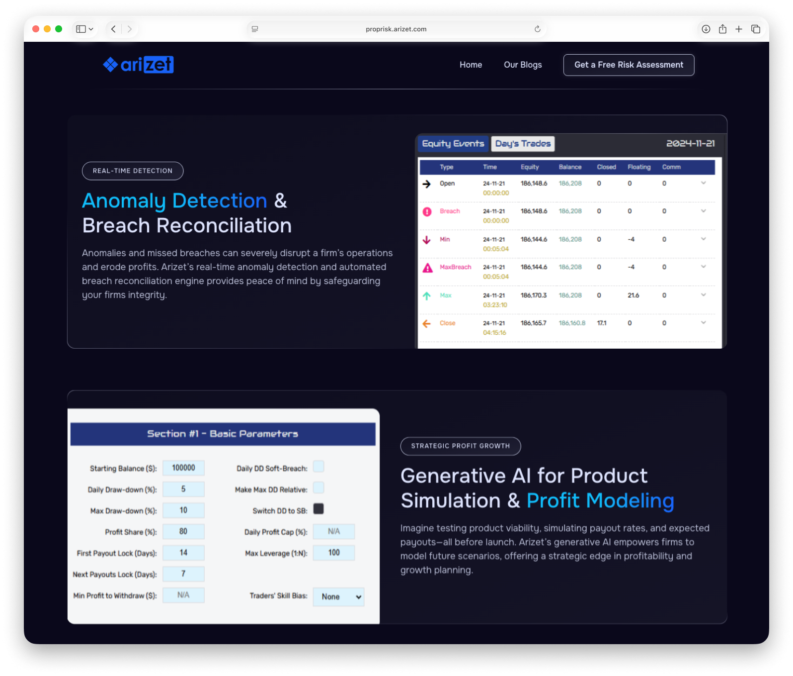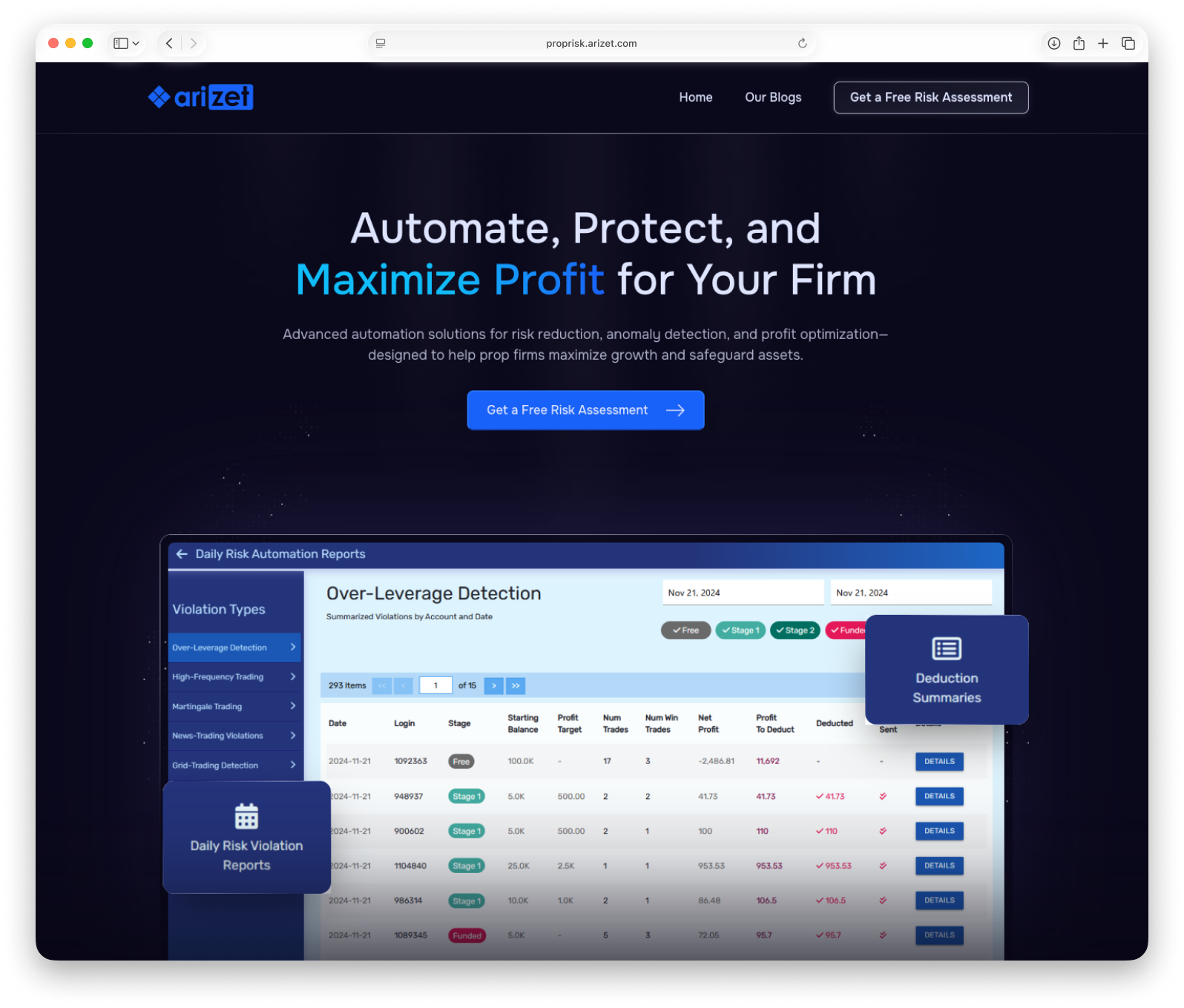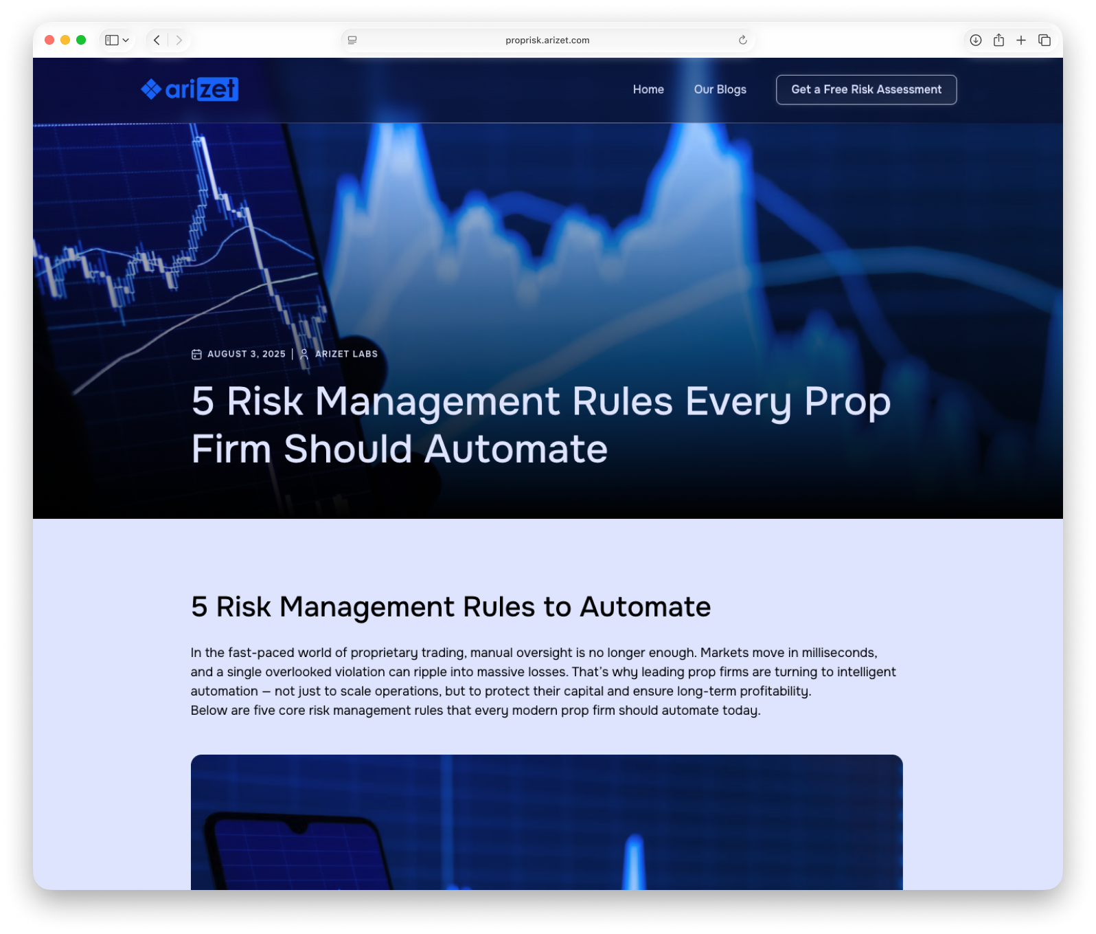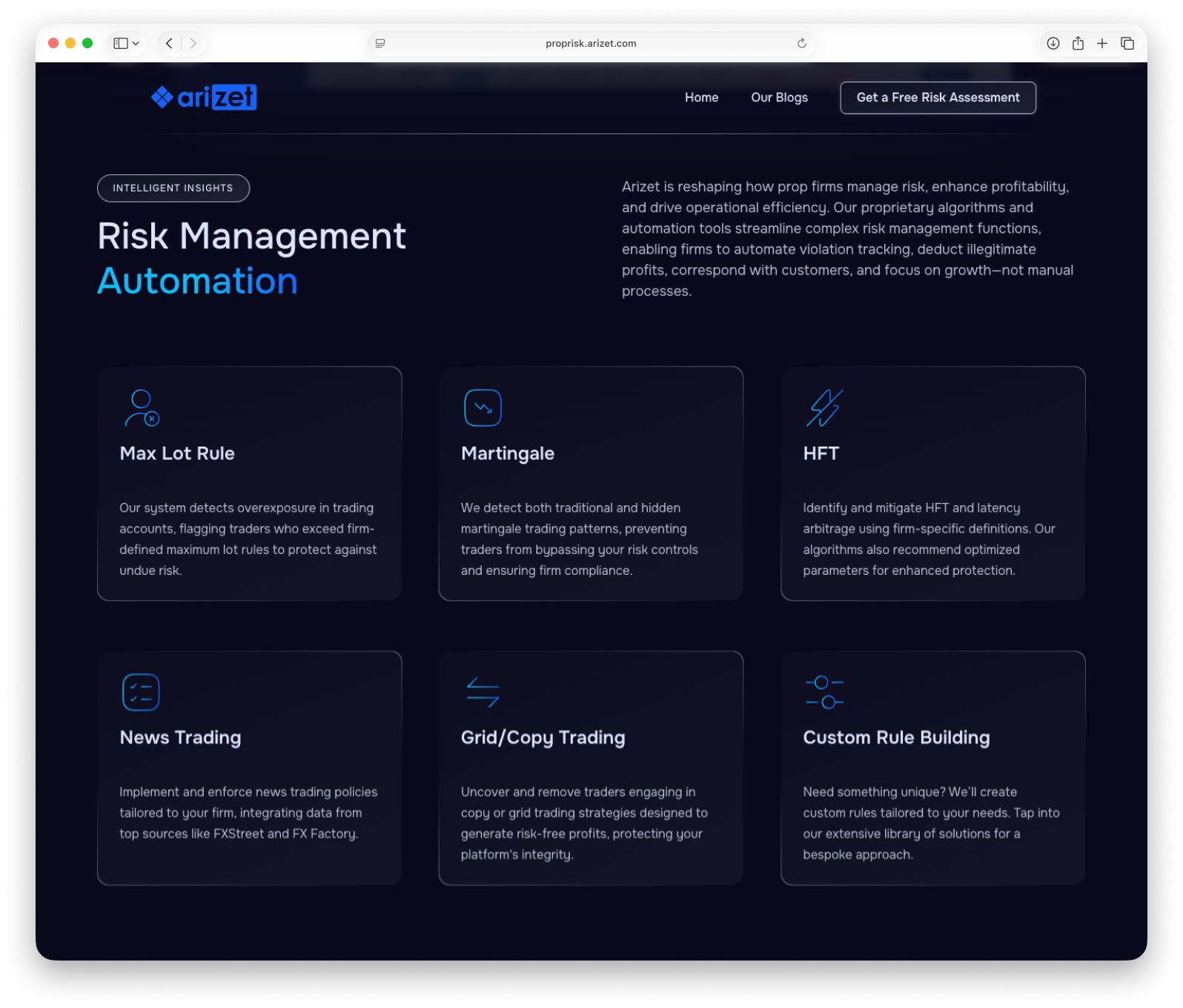 Arizet Prop Risk is a risk intelligence platform built for modern financial firms. We designed a refined, structured website that communicates complex concepts with clarity while reinforcing a credible, enterprise-level presence. As part of the build, we developed a custom CMS-powered blog—giving the team full control to publish and manage content seamlessly as the platform evolves.
